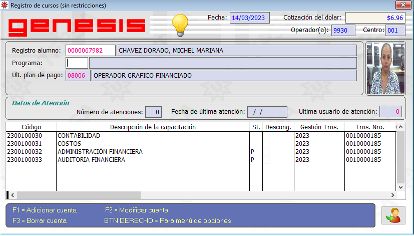 Génesis -> Sistemas Académicos -> Cursos de Extensión y Talleres -> Transacción -> Registrar alumnos a cursos vigentes (sin restricción), como se puede visualizar la estudiante tiene materias de examen de grado que no se ven en la programación de materias normal, sin embargo, solo tiene confirmadas las dos primeras materias de las cuatro
