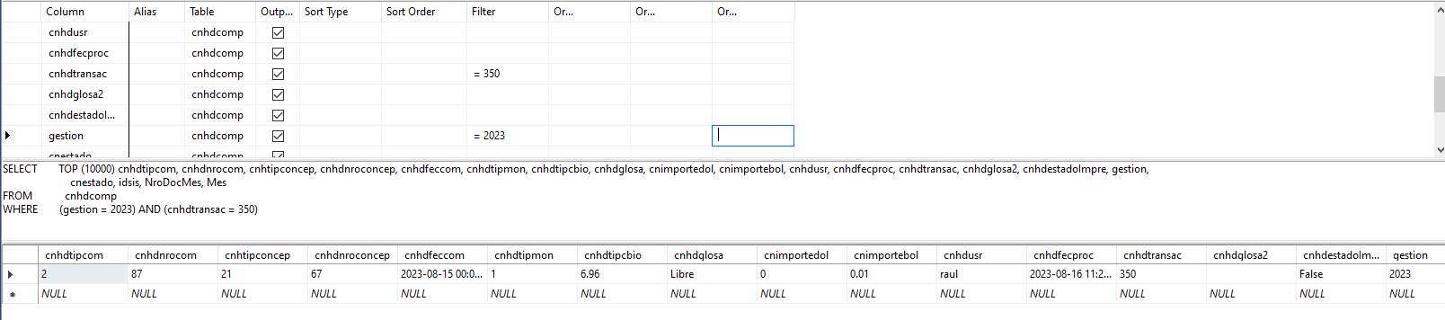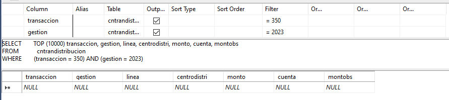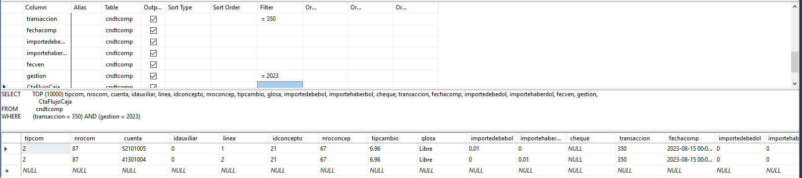 WHERE (gestion = 2023) AND (nrotranconta = 350)-- la imagen de abajo es el resultado de la consulta