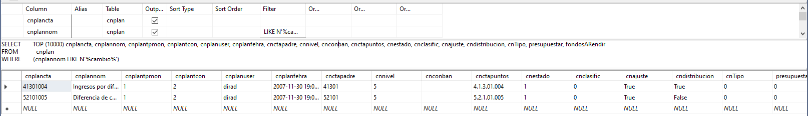 2.2) En cnplan buscar en "cnplannom" e ingresar "LIKE '%cambio%'2 para verificar el ingreso (4 o 2) y gasto (5)