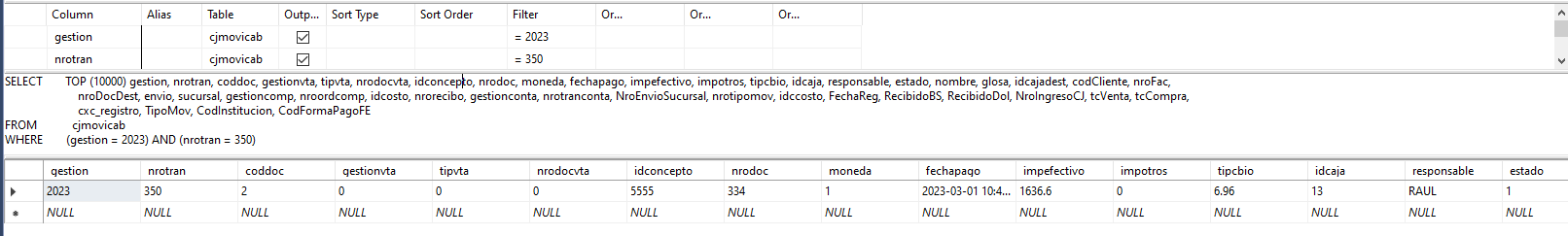 WHERE (Gestion = 2023) AND (nrotrancaja = 350) -- es igual a cjmovicab.nrotran