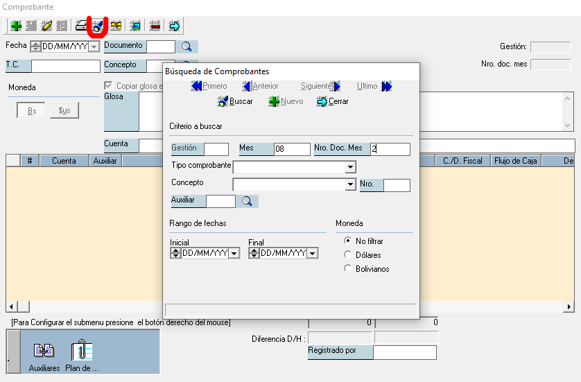 8) Verificar en el Sistema financiero (UTEPSA) Contabilidad -> Comprobante y buscar Nº de comprobante de egreso 08/2