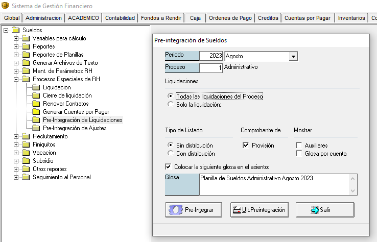 Paso 1: Ingresamos al sistema financiero -> Sueldos -> Procesos Especiales de Liquidaciones -> Pre-Integración de Liquidaciones, ingresamos el mes correspondiente mas el proceso, por ultimo dar clic en "Pre-Integrar"