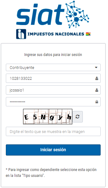 Ingresar a https://rvcc.impuestos.gob.bo/Autenticacion/index.xhtml? con los siguientes datos: