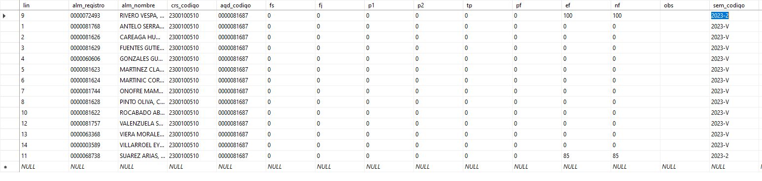 Ingresar a: Cursos_Extension.dbo.Notas_Parciales_Web y verificar que los estudiantes estén en un mismo semestre y en un mismo curso