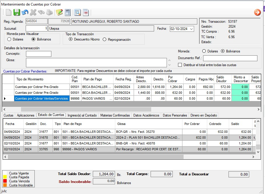Paso 1: Ingresar a la BD Latino 01, buscar en la tabla tz_PagoQrCab por la glosa (glosa LIKE'72928%') y cambiar el estado de procesado que estaba en 1 a 2, posteriormente copiar los datos en un excel sin el campo ID y cambiar el estado procesado a 0 y el campo nrodocdeuda a la deuda que corresponda el pago, en este caso como en la imagen anterior seria al nrodocdeuda 33765