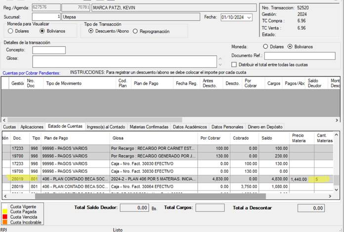 Paso 1: Modificar la cantidad de materias de un contrato, ingresar a la BD CXC cxc_movimientos (modificar el campo cxc_nromaterias) y en la BD Latino01 y trxconsumos (modificar el campo MatContratadas)